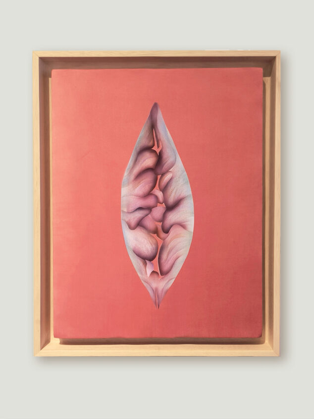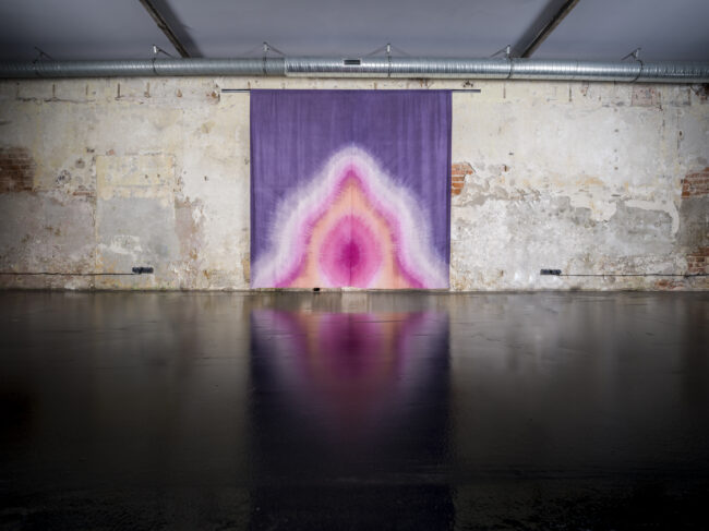 Obraz Eweliny Skowrońskiej „Dependency 02” jedwab barwiony rośliną Logwood, akryl, 62 x 42 cm.