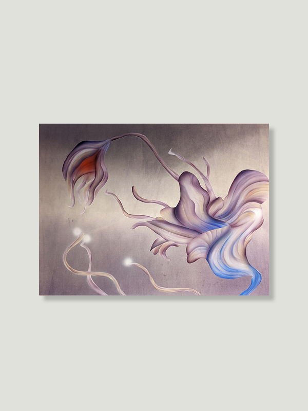 Obraz Eweliny Skowrońskiej „Careful, she is here II” jedwab barwiony rośliną Logwood, akryl, 35 x 45 cm.