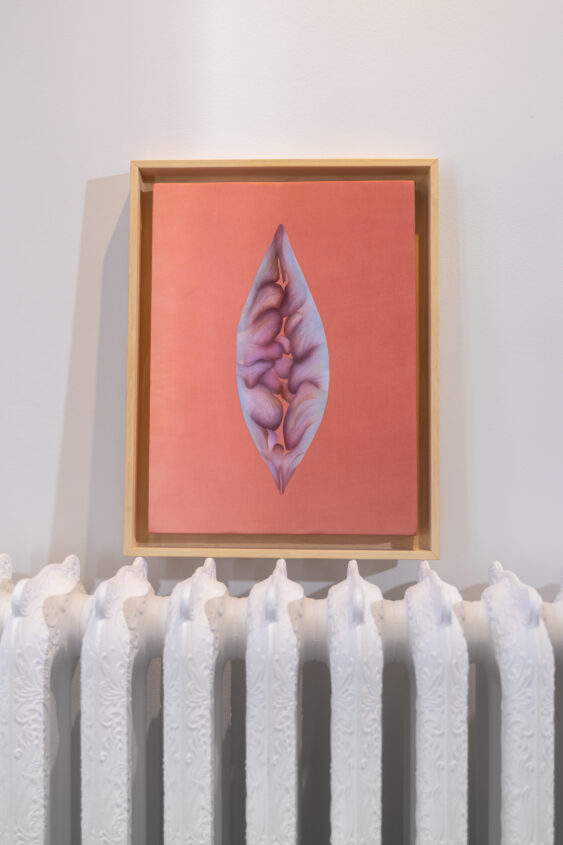 Widok wystawy: akwarela Aleksandy Batury „Flower” oprawiona w mosiężną ramę, za szkłem, z passe-partout, obrazy Eweliny Skowrońskiej, wykonane na jedwabiu barwionym rośliną Longwood: „Dependency I” i „Depedency II” oraz płaskorzeźby Moniki Rubaniuk z serii „Matecznik” wykonane z ręcznie formułowanego szkła.