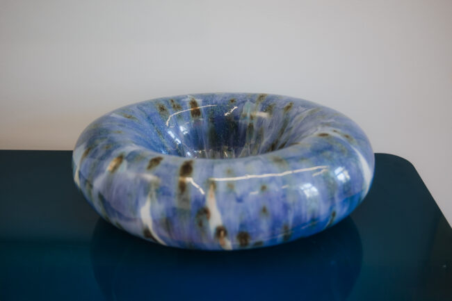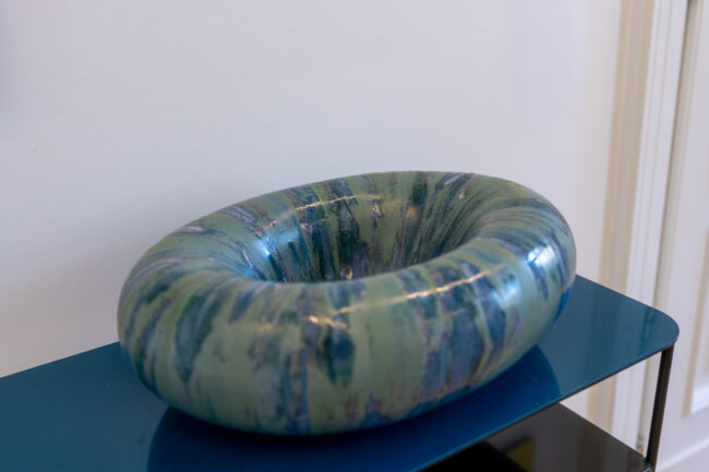Obrazy Grażyny Smalej” „Zatoka” i „Super Tulipan Parot„, olej na płótnie, 66 x 54 cm oraz misa Moniki Dąbrowskiej-Picewicz „Momenty 01„, kamionka i porcelana, 46 x 35 x1 5cm.